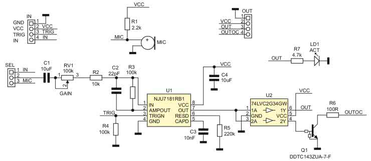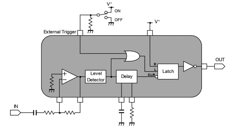 Prezentowany detektor poziomu sygnału audio bazuje na specjalizowanym układzie NJU7181 firmy JRC. Moduł znajdzie zastosowanie w sytuacjach, gdy chcemy dostać cyfrową informację o przekroczeniu zadanego poziomu lub wyzwalać pracę urządzenia po pojawieniu się sygnału audio. Strukturę wewnętrzną układu pokazano na rysunku 1. Integruje on w sobie wzmacniacz o regulowanej czułości z detektorem poziomu sygnału, układy opóźnienia i sterowany zatrzask. Dzięki zastosowaniu NJU7181 moduł uproszczony jest do minimum i bez problemu mieści się na płytce drukowanej w formacie 20×20 mm zgodnej ze standardem Grove.