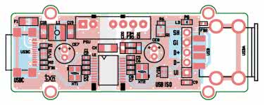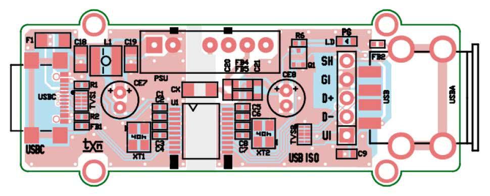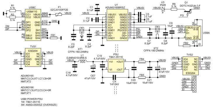 Płytka zawiera dwa obwody oscylatorów 24 MHz niezbędnych do działania układu U1. W przypadku ADuM3165 należy zastosować kwarc XT1 (24 MHz) i kondensatory C3,4, a w przypadku ADuM3166 odpowiednio XT2 i C7,8. Port USB po izolacji, poprzez drabinkę zabezpieczającą TVS2, wyprowadzony jest na gniazdo USBA oraz na złącze szpilkowe USB. Moduł uzupełnia sygnalizator poprawności napięć zasilania na elementach Q1, R6, LD, sterowanych z wyprowadzenia PGOOD U1. Stan wysoki PG sygnalizuje poprawność napięć zasilania po obu stronach interfejsu.