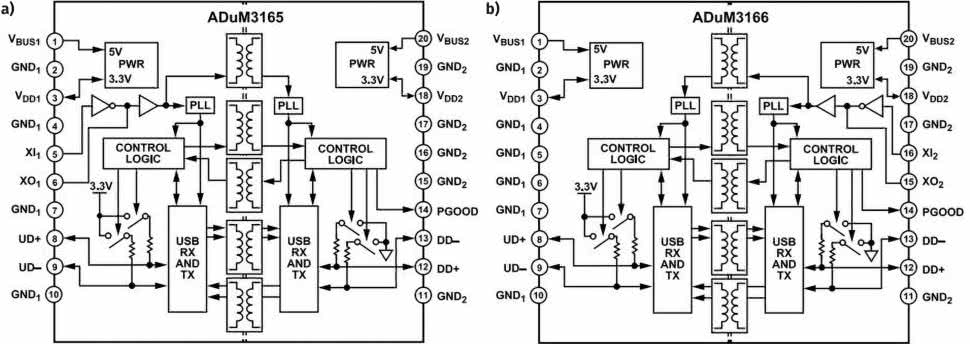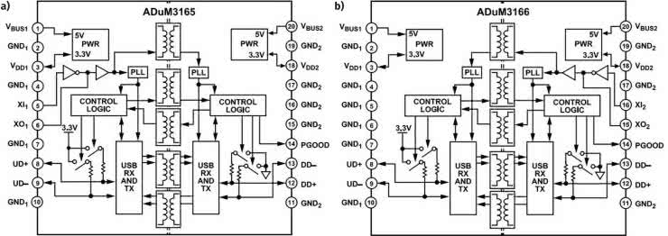 Strukturę wewnętrzną wspomnianych na początku układów pokazano na rysunkach 1a i 1b. Oba typy są zgodne pod względem wyprowadzeń, za wyjątkiem obwodu oscylatora, który w ADuM3165 znajduje się po stronie portu Upstream, a w ADuM3166 po stronie Downstream. Modelowa płytka jest zatem zgodna z obydwoma modelami tychże izolatorów scalonych.