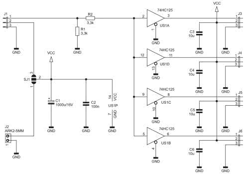 Schemat ideowy pokazano na rysunku 1. Rolę bufora cyfrowego pełni układ 74HC125, który cechuje się znikomym poborem prądu oraz zdolnością do regeneracji zboczy sygnału wejściowego, a to za sprawą wbudowanych przerzutników Schmitta. Wejścia aktywujące zostały zwarte z masą, przez co wszystkie wyjścia pracują.