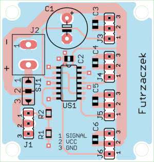 Układ wyprowadzeń w złączach: J1 (wejściowym) i J3…J6 (wyjściowych) jest następujący: 1 – sygnał, 2 – zasilanie, 3 – masa. Jest spotykany w większości serwomechanizmów dostępnych na rynku.