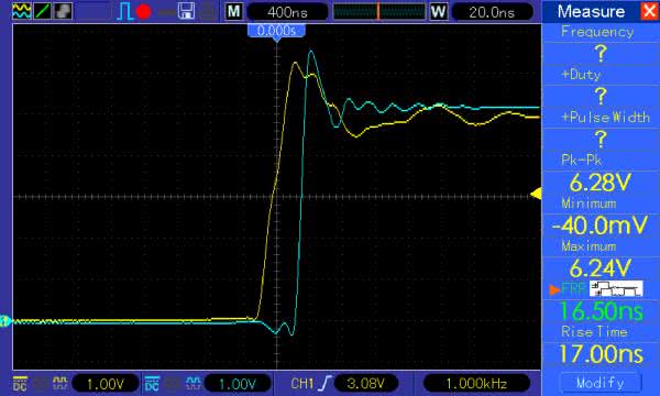 Przebieg żółty to sygnał wejściowy, a niebieski – wyjściowy, widoczna jest poprawa jakości zbocza narastającego. Pomiar wykonano przy napięciu zasilającym 5 V.