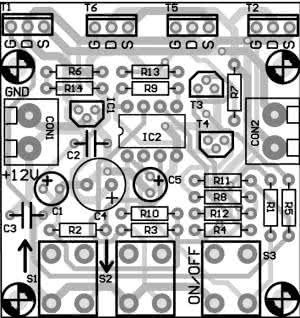 Na rysunku 2 pokazano rozmieszczenie elementów na płytce drukowanej. Montaż jest typowy, a układ zmontowany ze sprawnych elementów nie wymaga żadnej regulacji i po włożeniu zaprogramowanego procesora w podstawkę działa natychmiast poprawnie. Jeżeli w momencie włączenia zasilania przytrzymamy przez chwilę przycisk S3, to układ rozpocznie pracę w trybie regulacji ze skokiem co 10%.