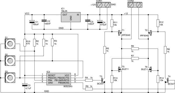 Schemat elektryczny układu pokazano na rysunku 1. Sterownik zbudowano w oparciu o 8-wyprowadzeniowy mikrokontroler AT90S2343, do którego aktywnych wyprowadzeń dołączono proste układy wykonawcze i sterujące. Jako elementy wykonawcze, bezpośrednio zasilające dołączony do regulatora silnik, zastosowano cztery tranzystory MOSFET, pracujące w układzie mostka, w którego przekątnej został włączony silnik.