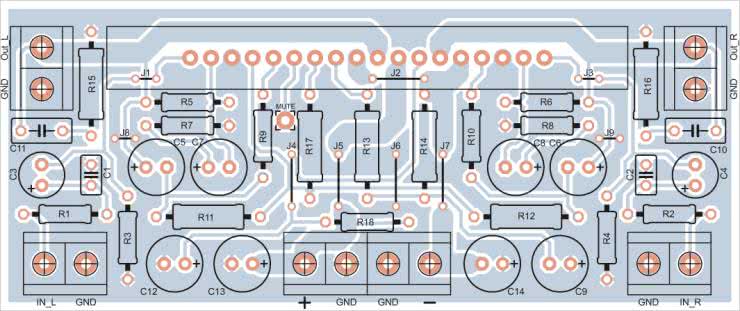Schemat montażowy wzmacniacza zaprezentowano na rysunku 2. Płytkę wykonano na laminacie jednostronnym, przez co było konieczne zastosowanie kilku zworek.