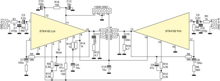 Na rysunku 1 zamieszczono schemat ideowy wzmacniacza. Pojedynczy układ STK4182 wzmacnia sygnał stereofoniczny. Elementy R1, C1, C3, R3 (dla kanału lewego) oraz R2, C2, C4, R4 (dla kanału prawego) pełnią rolę filtrów zapobiegających wzbudzaniu się. Elementy R5, R7, C7, R6, R8, C8 kształtują charakterystykę wzmocnienia w funkcji częstotliwości. Dobrano je tak, aby była ona płaska w jak najszerszym zakresie przenoszonych częstotliwości.