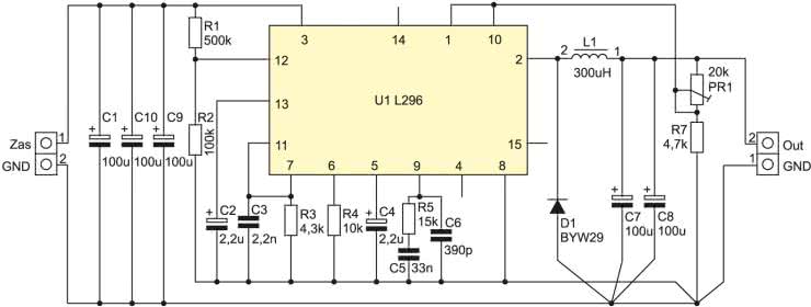 Prawidłowo zmontowana przetwornica powinna zadziałać po dołączeniu zasilania. Jedyną czynnością regulacyjną jest ustawienie za pomocą potencjometru montażowego PR1 wymaganego napięcia wyjściowego.