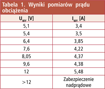 Przykładowe pomiary prądu obciążenia i napięcia wyjściowego przetwornicy przy napięciu wejściowym 31 VDC zamieszczono w tabeli 1.