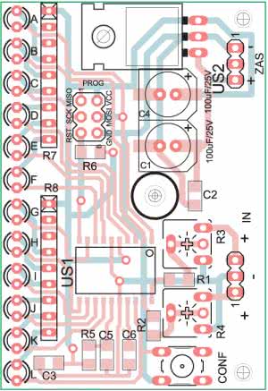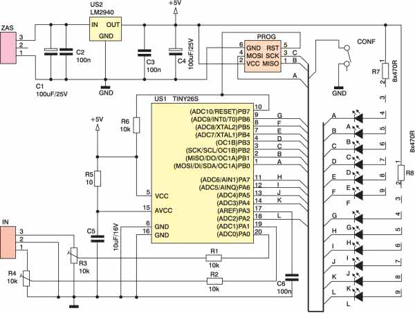 Schemat układu pokazano na rys. 1. US2 i C1…C4 to elementy zasilacza +5 V. R5, C5 i C6 filtrują zasilanie przetwornika ADC. Rezystor R6 wymusza potencjał na doprowadzeniu Reset mikrokontrolera. R1…R4 tworzą dzielniki sygnału wejściowego, R7 i R8 (R-pack 8×470 Ω) ustalają prąd świecenia diod LED. Dodatkowo na płytce umieszczono przycisk CONF i złącze programowania.