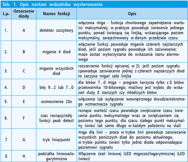 W tryb konfiguracji wchodzimy krótko przyciskając klawisz CONF. Zacznie migotać dioda „I” sygnalizująca tryb konfiguracji i pierwsza dioda linijki czyli „A”. Każde kolejne krótkie naciśnięcie przycisku powoduje przesuwanie się punktu świecącego po diodach od „A” do „H”. Świecenie/miganie diody w danym punkcie oznacza załączenie/wyłączenie funkcji. Dłuższe przytrzymanie przycisku powoduje zmianę stanu świecenia odpowiedniej diody. Gdy zacznie migać tylko dioda w punkcie „H”, to wciśnięcie i przytrzymanie przycisku, aż dioda przestanie migać, powoduje zapis ustawień i wyjście z trybu konfiguracji. Krótkie wciśnięcie powoduje ponowne rozpoczęcie konfiguracji. W tab. 1 umieszczono zestawienie wszystkich funkcji, ich krótki opis i diody odpowiadające im w trybie konfiguracji.