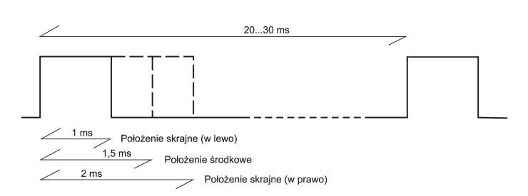 Odbiorniki zdalnego sterowania mogą być zasilane napięciem 3,5...9 V, natomiast serwomechanizmy 4,8...6 V. Aby dostosować napięcie ze źródła zasilania do potrzeb toru odbiorczego, wykorzystuje się stabilizatory, które obniżają napięcie. Sterowanie modelem odbywa się poprzez wysyłanie impulsów o określonym okresie powtarzania i zmiennym wypełnieniu do serwomechanizmów. Wypełnienie impulsu określa aktualne położenie serwomechanizmu. Typowym czasem powtarzania impulsów sterujących jest 20 ms, chociaż serwomechanizmy działają poprawnie nawet przy czasach powtarzania 30 i więcej ms. Czas trwania impulsu to 1...2 ms. Położeniu środkowemu serwomechanizmu odpowiada czas 1,5 ms. Amplituda impulsu zawiera się w granicach 3...5 V. Na rys. 1 przedstawiono parametry impulsu sterującego serwomechanizmem.