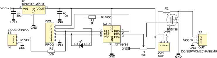 Na rys. 2 widać schemat układu. W celu umożliwienia pracy układu w szerokim zakresie napięć zasilania zastosowano stabilizator SX1117. Układ ten zapewnia poprawną stabilizację napięcia wyjściowego już przy napięciu zasilania 4,5 V. Maksymalne napięcie wejściowe nie może przekraczać 20 V. Napięcie zasilania serwomechanizmu jest podawane bezpośrednio z odbiornika. Jest to najczęściej stosowana metoda. Każdy „szanujący się” odbiornik może zasilać wszystkie podłączone do niego serwomechanizmy.