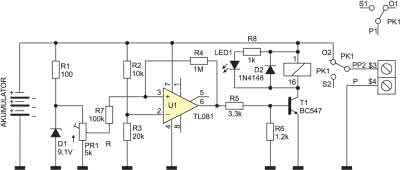 Układ zbudowany jest na wzmacniaczu operacyjnym TL081 w konfiguracji komparatora dwóch napięć. Napięcie wzorcowe zbudowane na elementach R1, D1 i ustawione przy pomocy PR1 porównywane jest z napięciem jakie odkłada się na rezystorze R3, które jest równe 2/3 napięcia występującego na zaciskach akumulatora. Kiedy napięcie na rezystorze R3 spadnie poniżej napięcia ustawionego za pomocą PR1, to na wyjściu wzmacniacza operacyjnego pojawia się stan wysoki, który odłącza poprzez przekaźnik odbiornik. W tym momencie nasza nawigacja przechodzi na zasilanie z własnej baterii.