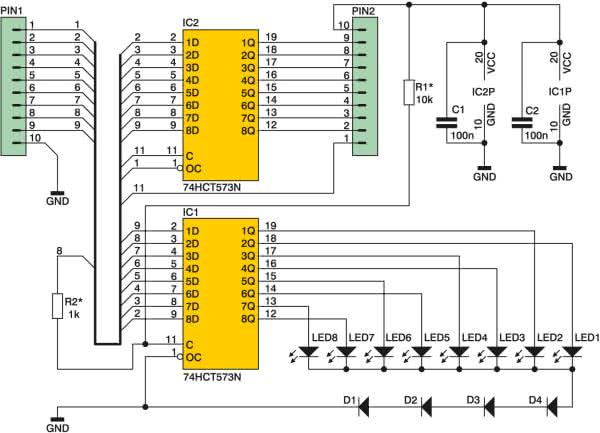 Układ IC1 pełni funkcję bufora prądowego. Jest to również 74HCT573, którego wejścia są połączone z wejściami analizatora, a do wyjść dołączone są diody. Nóżka 11 tego układu to wejście zatrzasku, połączone przez R1 do plusa zasilania, zatem stan wyjść zawsze odpowiada stanowi wejść. Opcjonalnie nóżka 11 może też być podłączona przez R2 do siódmego wejścia analizatora, wtedy stan wyjść, czyli świecenie diod jest synchronizowane przebiegiem na tym wejściu. Takie rozwiązanie może okazać się pomocne w niektórych przypadkach. Dołączenie R2 spowoduje podciągnięcie wejścia analizatora do +5 V przez rezystancję 11 kΩ, o czym należy pamiętać. Diody D1...D4 zapewniają odpowiednie zasilanie diod LED.