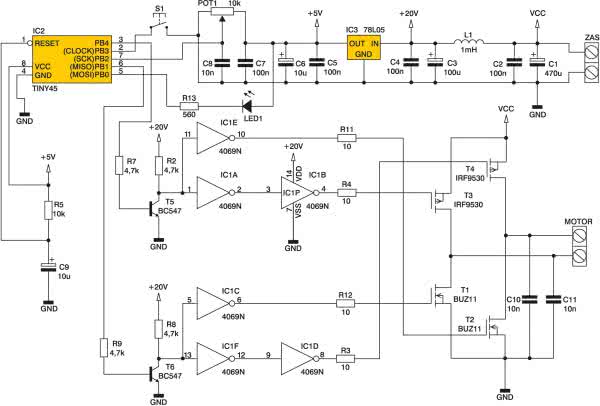 Przedstawiane urządzenie jest regulatorem mocy i kierunku obrotów silnika prądu stałego, ale doskonale sprawdza się też jako regulator mocy np. żarówki. Schemat układu przedstawiono na rys. 1. Elementy C1...C4 i L1 filtrują napięcie zasilające. Jest to niezmiernie ważne dla układów z impulsowym stopniem mocy. Stabilizator IC3 wraz z C5 i C6 dostarcza napięcie 5 V dla mikrokontrolera IC2. Elementy C5 i C9 zapewniają zerowanie układu po załączeniu zasilania. Tranzystory T5 i T6 wraz z elementami R2, R7...R9 dopasowują poziomy napięć dla bramek układu IC1, a te stanowią sterownik tranzystorów wyjściowych. Pracą urządzenia steruje bogato wyposażony mikrokontroler ATtiny45 w niepozornej obudowie ośmionóżkowej. Głównym zadaniem programu jest konfiguracja wewnętrznego timera mikrokontrolera jako generatora PWM, w którym wypełnienie impulsu jest proporcjonalne do napięcia na wejściu przetwornika analogowo-cyfrowego wbudowanego w IC2. Częstotliwość pracy generatora PWM wynosi około 500 Hz dla trybu pierwszego oraz około 250 Hz dla trybów 2 i 3.