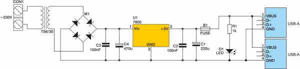 Na rys. 1 przedstawiono schemat elektryczny zasilacza. Napięcie wyjściowe transformatora TR1, po wyprostowaniu przez mostek M1 oraz po przejściu przez filtr pojemnościowy C1 i C2, jest podawane do stabilizatora napięcia U1 (7805). Napięcie o wartości +5 V występujące na wyjściu układu U1 jest filtrowane przez kondensatory C3 i C4.