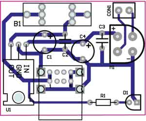 Napięcie to poprzez bezpiecznik B1 trafia do podwójnego złącza USB. Dioda LED D1 sygnalizuje jego obecność. Rozmieszczenie elementów na płytce drukowanej pokazano na rys. 2.