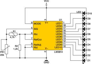 Prezentowany wskaźnik temperatury może znaleźć zastosowanie również jako dodatkowy, niepowtarzalny gadżet w samochodach, które mają fabryczne termometry. W mierniku zastosowano układ scalony woltomierza liniowego, służący do wysterowania słupkowego lub punktowego wyświetlacza składającego się z dziesięciu diod LED. Napięcie sterujące tym układem (SIG) podawane na wyprowadzenie 5 U1 jest pobierane z dzielnika zbudowanego z termistora R1 i potencjometru montażowego PR1. Miernik należy wyskalować w następujący sposób: posługując się naczyniem z gorącą wodą należy tak wyregulować potencjometr PR1, aby przy temperaturze 80°C świeciła pierwsza zielona doda LED. Kolor diod LED zależy oczywiście od indywidualnego gustu. W układzie modelowym zastosowano dwie zielone diody LED na zakres „zimny”, cztery żółte na zakres normalny i cztery czerwone na zakres gorący. Zostały one zastosowane jako wyświetlacz słupkowy przez dołączenie wyprowadzenia 9 do plusa zasilania. Bez tego połączenia wyświetlacz pracowałby w trybie punktowym.