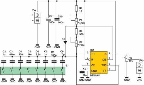 Schemat generatora przedstawiono na rys. 1. Częstotliwość sygnału wyjściowego zależy od elementów R1, R2, P1, P2 oraz sumarycznej pojemności kondensatorów C2...C9. Ponadto można regulować współczynnik wypełnienia sygnału w zakresie od 0 do 100%, ale tylko wtedy, gdy zastąpimy rezystory R1 i R2 zworami. Stosując pewną wartość rezystorów R1 i R2 ustalamy minimalny i maksymalny procent wypełnienia przebiegu.
