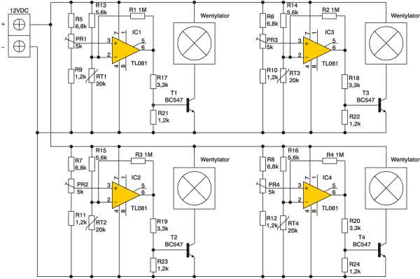 Układ przeznaczony do sterowania czterema wentylatorami komputerowymi, zbudowany jest z czterech identycznych bloków (rys. 1). Zasada działania zostanie omówiona na przykładzie tylko pierwszego bloku. W układzie zastosowano wzmacniacz operacyjny pracujący jako komparator napięcia. Porównuje on napięcie z dzielnika, którego elementem jest termistor RT1, z napięciem regulowanym za pomocą potencjometru montażowego PR1. Jeżeli oporność termistora RT1 zmniejszy się, powodując powstanie na wejściu 2 napięcia mniejszego od ustawionego na wejściu 3, to na wyjściu wzmacniacza pojawi się „stan wysoki”. Tranzystor T1 zacznie przewodzić, włączając wentylator. Rezystor R1 wprowadza do układu niewielką histerezę, zabezpieczając go przed ewentualnym wzbudzeniem. Układ pracuje na zasadzie włącz/wyłącz, czyli włącza się w momencie, gdy element chłodzony uzyska temperaturę powodująca załączenie wentylatora. Po ochłodzeniu wentylator się wyłącza.
