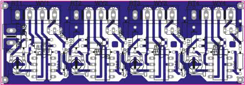 Na rys. 2 przedstawiono rozmieszczenie elementów na jednostronnej płytce drukowanej. Montaż układu zaczynamy od najmniejszych elementów, a kończymy na najwyższych.