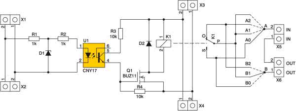 Schemat modułu pokazano na rys. 1. Elementem wykonawczym jest przekaźnik K1 sterowany tranzystorem T1 typu BUZ11. Zastosowanie tranzystora MOSFET mocy daje możliwość dobrania typu przekaźnika w bardzo szerokim zakresie prądu i napięcia cewki. Tranzystor T1 jest sterowany przez transoptor U1 typu CNY17 wraz z rezystorami R4 i R5. Zastosowanie transoptora ma dwie ważne zalety. Zapewnia separację galwaniczną układu sterującego od modułu wykonawczego. Co prawda przekaźnik zapewnia taką separację, ale tylko pomiędzy modułem wykonawczym a urządzeniem, którym będziemy sterować. Drugą zaletą jest bardzo elastyczny sposób sterowania, niezależnie od poziomu aktywnego (niski lub wysoki) w bardzo szerokim zakresie napięć 3...24 V, z możliwością przesunięcia górnego zakresu. Elementy R1, R2 i D3 ustalają prąd diody zawartej w strukturze transoptora.