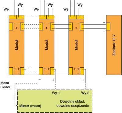 Jeśli zamierzamy sterować urządzeniami zasilanymi z sieci energetycznej 230 VAC, możemy użyć do zasilania modułu zasilacza beztransformatorowego. Takie połączenie dwóch modułów i zasilacza powstało jako prototyp opisywanego układu. Całość jest dopasowana do obudowy typu KM29. Zasilacz jest omówiony jako oddzielne urządzenie.