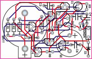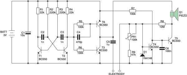 Tranzystory T1 i T2 oraz elementy R2, R3, C2 i C3 stanowią generator przebiegu prostokątnego o częstotliwości około 3 kHz. Spełnia on dwie funkcje – generuje prąd przepływający przez elektrody oraz sygnał sterujący brzęczykiem.