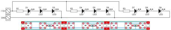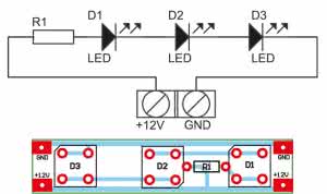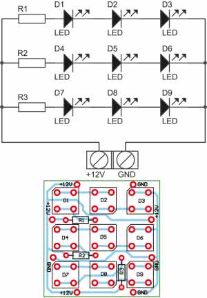 Płytki drukowane umożliwiają budowę pojedynczych modułów składających się odpowiednio z 3 i 9 diod LED. Niewątpliwą zaletą modułów jest możliwość ich łączenia kaskadowego. Każda płytka na spodniej stronie wyposażona została w odpowiednio powiększone punkty lutownicze, za pomocą których możemy, lutując „od spodu“ odcinki srebrzanki, zmontować linijkę świetlną o dowolnej długości. Przydatną może okazać się również kwadratowa płytka mieszcząca po trzy diody LED w trzech rzędach, na której również przewidziano punkty lutownicze umożliwiające łączenie pojedynczych modułów. Łącząc moduły ze sobą należy pamiętać o zapewnieniu odpowiedniej wydajności prądowej zasilacza, która musi być zawsze większa niż obliczony pobór prądu. Podczas montażu diod LED należy zwrócić baczną uwagę na ich polaryzację, bowiem różni się ona w zależności od koloru diody. Można sprawdzić to również przy pomocy omomierza, nie spowoduje to uszkodzenia diody, jak to miało miejsce podczas testowania pierwszych diod LED dużej mocy. Rezystory ograniczające prąd diod należy dobrać w zależności od typu posiadanych diod.