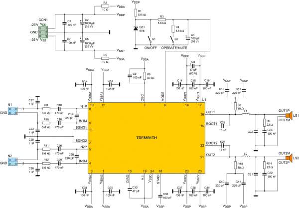 Układ TDF8591 jest to wysokiej klasy stereofoniczny wzmacniacz pracujący w klasie D. Dedykowany m.in. do nagłośnienia systemu car-audio, po zastosowaniu odpowiedniej przetwornicy napięcia. Moc wyjściowa, jaką można uzyskać z tej kostki to 2×100 W, przy impedancji głośnika 4 Ω. Warto zwrócić szczególną uwagę na wymiary samej kostki TDF8591. Patrząc na płytkę wzmacniacza do głowy przychodzi tylko jedno pytanie, mianowicie gdzie się podział główny element aktywny? Zapewniam, że jest! Układ jest wykonany w technologii SMD, a wymiary jego obudowy to zaledwie 16×11 mm! Właśnie klasa D pozwoliła na tak dużą miniaturyzację układu, przy jego sprawności równej aż 90%. Producent projektując układ wykonał go tak, że trzeba go montować po stronie lutowania, i właśnie z tego względu, na pierwszy rzut oka, nie widać go na modelowej płytce.
