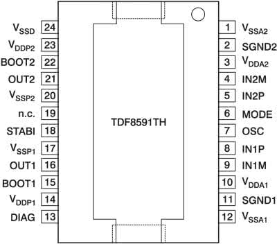Wzmacniacz może pracować z głośnikami o impedancji już od 2 Ω. Schemat ideowy końcówki mocy jest przedstawiony na rys. 1. Układ TDA3591 zawiera w swojej strukturze tranzystory mocy, modulatory PWM, układy wejściowe, układ pomiaru temperatury, prądu i napięcia. Opis wyprowadzeń jest przedstawiony na rys. 2.