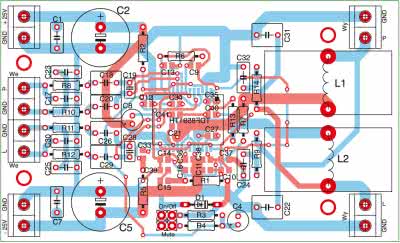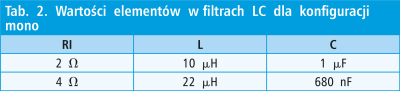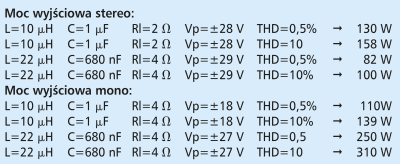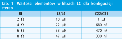 Analogowy sygnał wejściowy jest zamieniany na modulowany sygnał impulsowy. Są nim sterowane wyjściowe tranzystory mocy, a ze względu na impulsowy charakter sygnału, tranzystory pracują tylko w stanie albo otwartym, albo zamkniętym. Moc jaka się na nich wydziela zależy wyłącznie od rezystancji kanału tranzystora oraz od czasów narastania i opadania zboczy. Ze względu na to, że tranzystory są zamykane i otwierane, na wyjściu układu pojawia się sygnał impulsowy o amplitudzie równej w przybliżeniu napięciu zasilania. W takim sygnale występuje bardzo dużo niepożądanych harmonicznych mogących zakłócać pracę innych urządzeń. Aby temu zapobiec, należy zastosować dolnoprzepustowe filtry LC. Filtry te mają jedną wadę, projektuje się je pod konkretną impedancję głośnika. W tab. 1 i 2 przedstawiono wartości dławików i kondensatorów C22 i C31 dla różnych impedancji w konfiguracji stereo oraz pracy mostkowej (mono).
