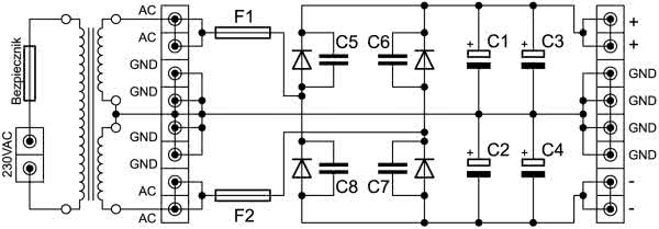 Zasilacz to zwykły prostownik dwupołówkowy. Dwa zmienne, symetryczne napięcia wtórne transformatora o przeciwnych fazach uzyskane z dwóch szeregowo połączonych uzwojeń podane są na złącza AC i GND zasilacza. Trafiają one przez topikowe bezpieczniki na mostek Graetz’a, w którym są prostowane dwupołówkowo i wygładzane przez kondensatory elektrolityczne C1, C3 dla dodatniej linii zasilania i C2, C4 dla ujemnej. Na wyjściu otrzymujemy napięcie dodatnie i ujemne względem masy układu. Jedynym zabezpieczeniem zasilacza przed uszkodzeniem są dwa bezpieczniki zwłoczne, które powinny być dobrane do konkretnej wartości mocy wzmacniacza oraz sumarycznej pojemności kondensatorów C1...C4. Należy zwrócić uwagę na to, że podczas podania zasilania na wejście, kiedy kondensatory są całkowicie rozładowane, płyną duże prądy ładowania, które już w fazie włączenia mogłyby przepalić bezpieczniki.