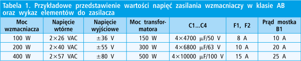 Należy to zrobić tylko dla jednej linii zasilającej. Prąd wtórny transformatora nie może być mniejszy niż prąd pobierany przez układ zasilany. W tab. 1 przedstawiono wartości elementów C1...C4, F1, F2 oraz typy mostka prostowniczego B1 dla trzech wartości mocy wzmacniacza.