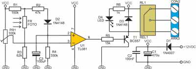 Zmiana intensywności oświetlenia fotorezystora FR, a konkretnie jej obniżenie powoduje wzrost napięcia na wejściu 2 wzmacniacza operacyjnego U1. W momencie kiedy to napięcie stanie się większe od napięcia panującego na wejściu 3 U1, na wyjściu wzmacniacza pojawi się „stan wysoki“. Konsekwencją tego faktu będzie spolaryzowanie bazy tranzystora T1 a w rezultacie załączenie przekaźnika RL1.