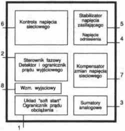 Na rysunku 1 przedstawiono uproszczony schemat blokowy układu U2008B. Podstawowy układ regulacji pokazano na rysunku 2.