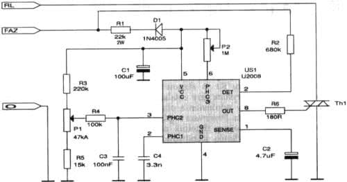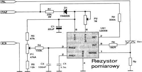 Jak wspomniano wcześniej, układ U2008 ma możliwość stabilizowania prądu płynącego przez silnik. zmniejszając wpływy wahań wartości napięcia zasilającego. Wiąże się to jednak z niewielką modyfikacją układu - w szereg z triakiem należy włączyć rezystor pomiarowy Rp (rysunek 4), na którym jest mierzony spadek napięcia. Wartość tego napięcia powinna wynosić 250 mVAC, dlatego rezystancje należy dobrać w zależności od indywidualnych wymagań.