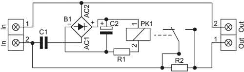 Kondensator C1 ustala wydajność prądową zasilacza beztransformatorowego a kondensator C2 ustala opóźnienie zadziałania przekaźnika. Opóźnienie rzędu jednej sekundy jest wystarczające do zabezpieczenia bezpieczników przed przepaleniem się przy załączaniu transformatora, ponieważ impuls prądowy zazwyczaj nie trwa dłużej niż 10 ms. W wypadku silnika prąd udaru jest uzależniony od obciążenia jego wału napędowego i jeżeli czas wynikający z zastosowanych wartości C1 i C2 jest zbyt krótki, to można spróbować zwiększyć wartość kondensatora C2 lub rezystancję rezystora R2.