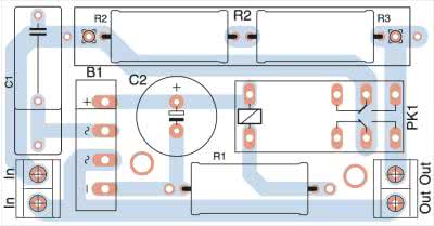 Schemat montażowy układu pokazano na rysunku 2. Płytkę zaprojektowano tak, aby rezystor R2 można było zastąpić dwoma rezystorami połączonymi szeregowo, a dzięki temu mającymi o połowę mniejszą rezystancję i moc.