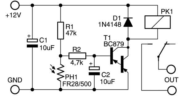 Kondensator C2 chroni układ przed krótkotrwałymi zmianami oświetlenia. Pozwala on wyeliminować możliwość powstania oscylacji wtedy, gdy poziom oświetlenia jest na granicy zadziałania układu. Oporność fotorezystora w świetle dziennym wynosi kilkaset Ω, a po zmroku wzrasta do kilkudziesięciu kΩ. Próg zadziałania włącznika można skorygować zmieniając rezystancję rezystora R1. Elementem wykonawczym jest przekaźnik o dopuszczalnym obciążeniu styków wynoszącym 2 A.