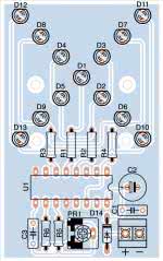 Schemat montażowy gwiazdy zamieszczono na rysunku 2. Wykonano ją na laminacie jednostronnym. Urządzenie jest łatwe w montażu, ponieważ zastosowano elementy przewlekane, które nie wymagają żadnych nastaw czy zaprogramowania. Po prawidłowo wykonanym montażu należy dołączyć zasilanie 5...12 VDC i wyregulować częstotliwość potencjometrem PR1 według własnych upodobań. Dioda D14 zabezpiecza układ przed odwrotną polaryzacją napięcia zasilania. Od strony lutowania można przykręcić za pomocą dwóch śrub koszyk na baterię 9 V (6F22).