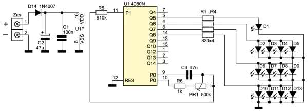 Na rysunku 1 pokazano schemat ideowy gwiazdki. Układ U1 to 14-bitowy licznik binarny typu 4060. Jest on bardzo wygodny w użyciu w aplikacjach, które wymagają licznika i generatora, ponieważ w jego strukturze umieszczono obwody generatora, którego częstotliwość może być ustalana za pomocą rezonatora kwarcowego lub elementów RC.