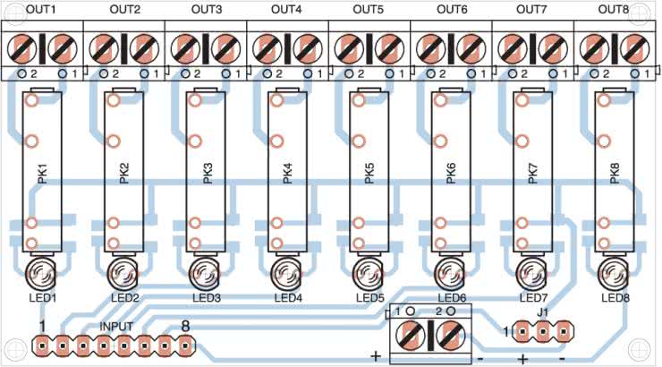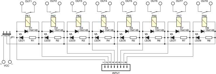 Schemat ideowy modułu przekaźników pokazano na rysunku 1, natomiast montażowy na rysunku 2. Jego konstrukcja umożliwia sterowanie przekaźników napięciem dodatnim lub ujemnym podawanym na złącze INPUT.