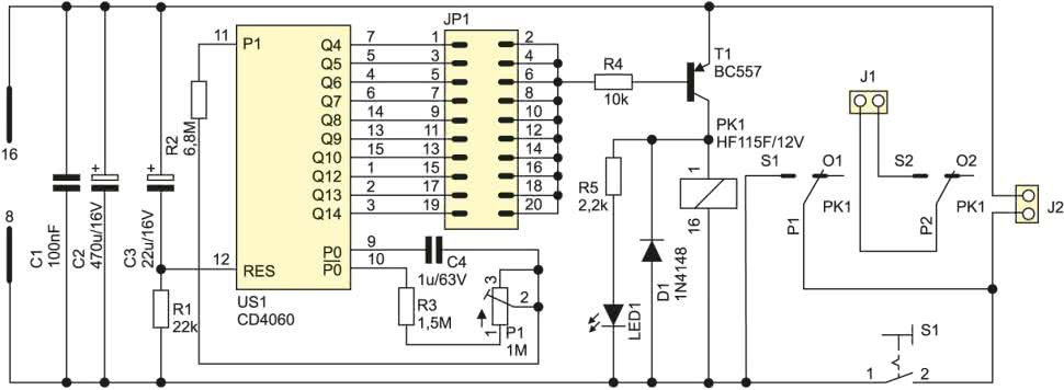 Schemat ideowy wyłącznika czasowego pokazano na rysunku 1. Wykonano go z użyciem taniego układu scalonego CD4060. Zawiera on w swojej strukturze gotowy oscylator oraz dzielniki częstotliwości sygnału z wewnętrznego generatora. Potencjometr P1, rezystory R2 i R3 oraz kondensator C4 ustalają okres generowanych sygnałów. Wyraża się on wzorem: T=2,2×C4×(P1+R3). Dla wartości elementów ze schematu i potencjometru P1 ustawionego w połowie, uzyskujemy następujące, przybliżone czasy trwania sygnałów na poszczególnych wyjściach US1 (od Q1…Q14): 35 s; 70 s; 140 s; 4,5 min; 9 min; 19 min; 38 min; 2,5 godz.; 5 godz.; 10 godz. Wyboru czas działania dokonuje za pomocą zworki. Zainicjowanie odmierzania czasu następuje po zwarciu styków przycisku S1. Jednocześnie jest wykonywane zerowanie układu US1, aby upewnić się, że odliczanie rozpoczyna się od 0. Dalsze podtrzymanie zasilania odbywa się za pomocą jednej pary zestyków przekaźnika PK1. Jego cewka jest zasilana za pośrednictwem tranzystora T1, który jest w stanie przewodzenia tylko wtedy, gdy na wybranym wyjściu układu panuje poziom niski. Po zakończeniu odliczania i ustawieniu wybranego wyjścia, tranzystor zatyka się, a przekaźnik odłącza zasilanie od układu i od sterowanego urządzenia. Wyłącznik w stanie spoczynku nie pobiera prądu ze źródła zasilania.