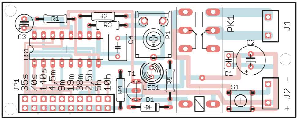 Kluczową rolę dla stabilności odmierzanych czasów gra jakość dielektryka kondensatora C4. Stąd warto zastosować w tym miejscu kondensator poliestrowy, a nie elektrolityczny. Jednak należy pamiętać, że generator ten nie jest stabilizowany kwarcowo i częstotliwość jego pracy – a w efekcie uzyskiwane czas załączeń – zależą od wielu czynników, przede wszystkim temperatury. Nie należy zatem stosować tego urządzenia do precyzyjnego odmierzania czasu. Wartość prądu płynąca przez złącze J2 jest ograniczona przez wydajność prądową styków przekaźnika, szerokość ścieżek i samo złącze śrubowe, więc dla prądów obciążenia przekraczających 2 A, warto zastosować zewnętrzny, odpowiednio dobrany przekaźnik.
