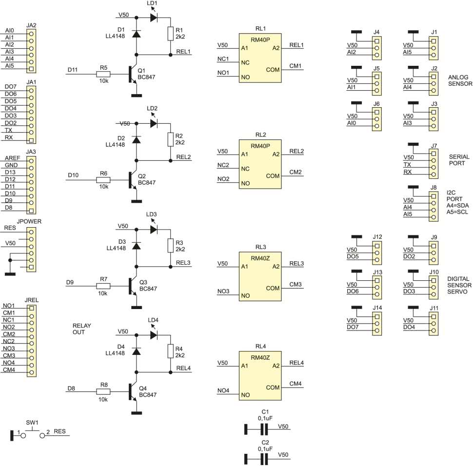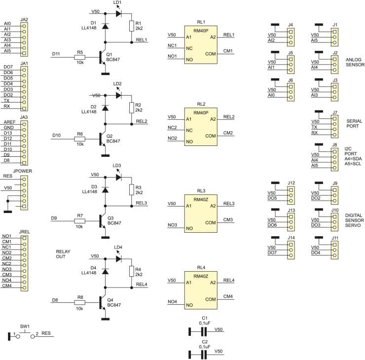 Schemat modułu dla Arduino pokazano na rysunku 1. Jako elementy wykonawcze RL1…RL4 wybrano nowoczesne przekaźniki elektromagnetyczne RM40 o niewielkim poborze mocy i cewce zasilanej z napięcia 5 V, co znacząco uprościło budowę modułu. Dwa z nich są przełączne, dwa zwierne. Wszystkie dostępne styki wyprowadzona są na złącze śrubowe JREL. Wyjścia D8…D11 sterują cewkami za pomocą tranzystorów Q1…Q4. Stany przekaźników sygnalizowane przez diody świecące LD1…LD4. Pozostałe piny wyprowadzone są na złącza SIP zgodne z Arduino Bricks (Sensor), umożliwiając doprowadzenie sygnałów do płytki bazowej Avtduino.