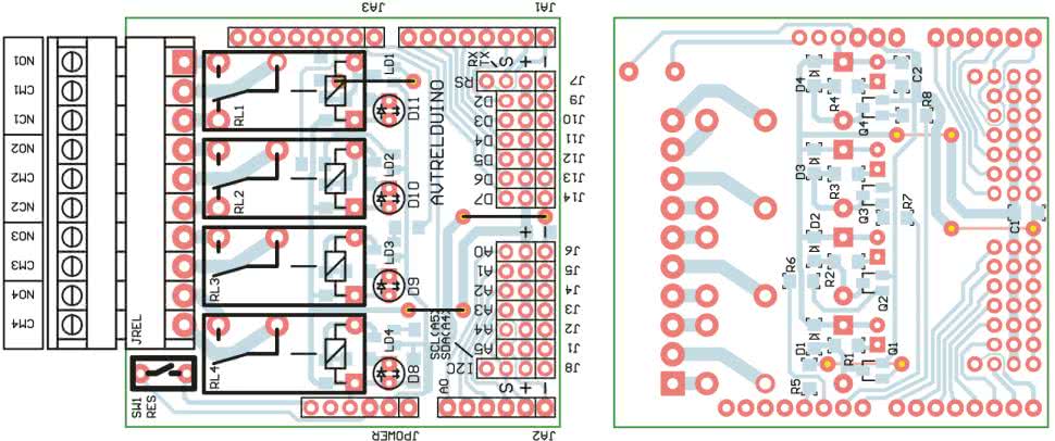 AVTRelDuino jest zmontowany na dwustronnej płytce drukowanej. Rozmieszczenie elementów przedstawia rysunek 2.