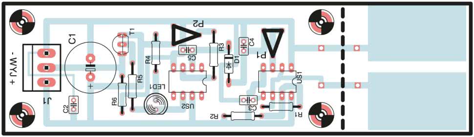 Przełącznik zbliżeniowy zmontowano na płytce o wymiarach 37 mm×140 mm, której schemat montażowy pokazano na rysunku 2.