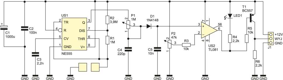 Wzmacniacz operacyjny US2 (TL081) pracuje w układzie komparatora, pracując z otwartą pętlą ujemnego sprzężenia zwrotnego. Porównuje wartość napięcia na C5 z napięciem regulowanym potencjometrem P2, podłączonym jako dzielnik rezystancyjny napięcia zasilającego. Wyjście US2 przełącza się w stan niski po przekroczeniu ustalonego progu, załączając diodę LED1 oraz polaryzując bazę T1 tak, że ten zaczyna przewodzić. Na wyjściu układu, dzięki rezystorowi R6, występuje poziom masy, zaś po jego uaktywnieniu, na wyjście pojawia się napięcie +12 V, które może służyć do sterowania przekaźnikiem. Rezystor R4 ogranicza prąd płynący przez LED1, zaś R5 ogranicza prąd bazy tranzystora T1.