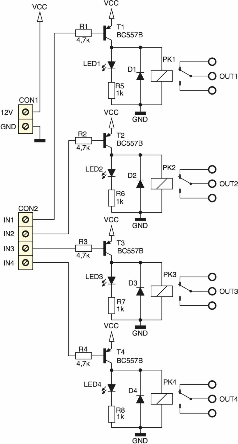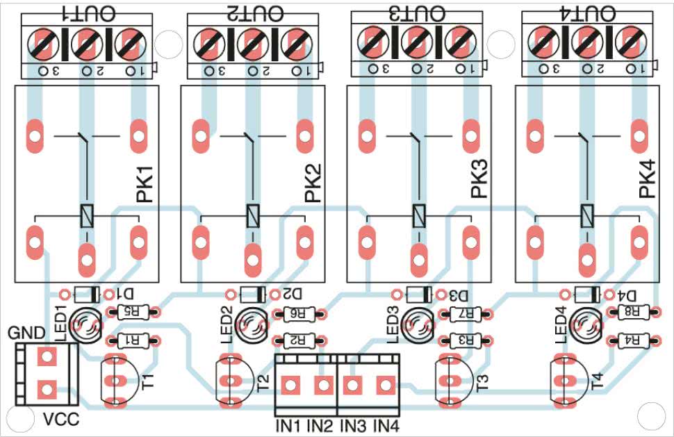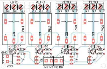 Elementami wykonawczymi są przekaźniki sterowane tranzystorami T1...T4. Diody świecące LED1...LED4 informują o fakcie zadziałania przekaźnika, natomiast o jego załączeniu decydują dodatnie sygnały pojawiający się na wejściach IN1...IN4 złącza CON1.